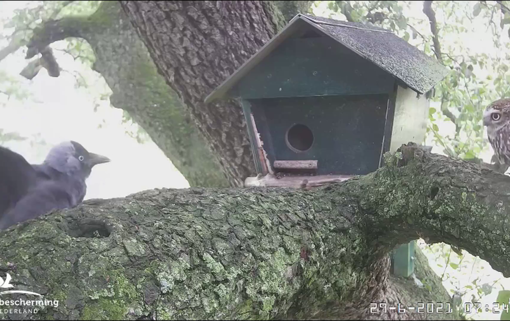 29 juni: Man steenuil jaagt op de kauwtjes en roept naar vrouw.