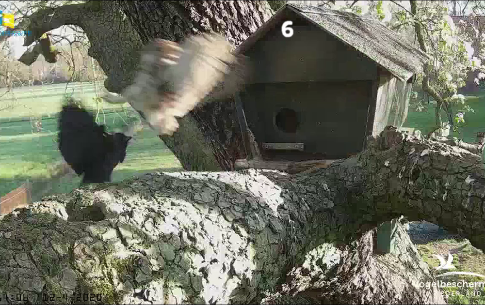 Man steenuil laat merken dat hij weer terug en fit is. Binnen een uur jaagt hij 19x de kauwtjes de stuipen op het lijf. Niet altijd met groot succes. Hij zoekt 2x zijn heil in de nestkast. Toch weet hij wel een zekere rust voor de rest van de 1e paasdag te bewerkstelligen.