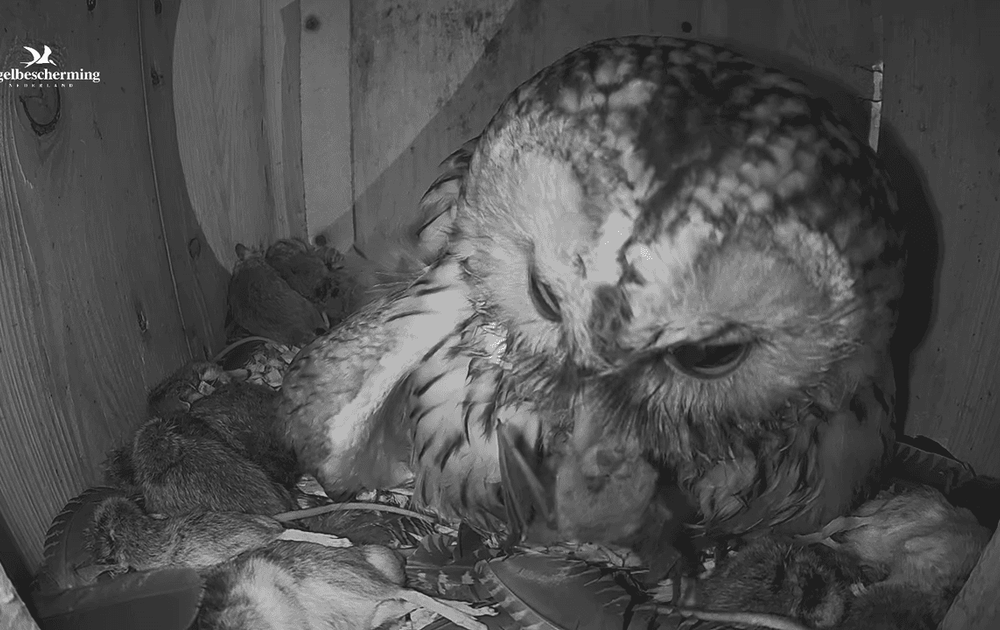 We zien weer hetzelfde scenario als de laatste keer: man komt met een muis, maar vrouw zit net de kuikens te voeden en heeft haar mond al vol.