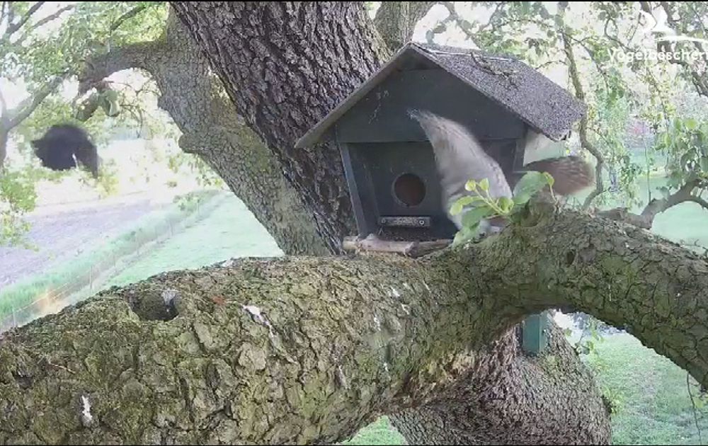 Man steenuil zit voor de nestkast van 6:51u-7:16u. Hij lijkt weer wat alerter dan gisteren. Kauwen en ekster blijven op een afstand. Het rechteroog zit nog wel dicht. Vrouw steenuil doet een nadrukkelijk beroep op hem.