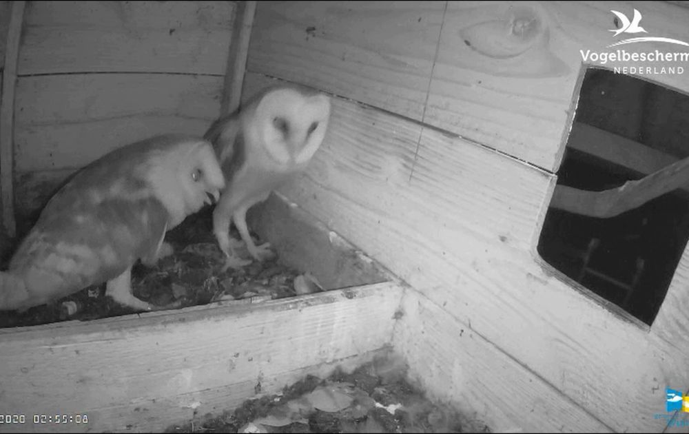 Het eerste kuiken begint aan zijn eerste stapjes! En terwijl vrouw kerkuil even de vleugels aan het strekken is krijgt de man eindelijk de kans zijn kroost van dichtbij te bewonderen. Maar of zij daar nou zo blij mee is?