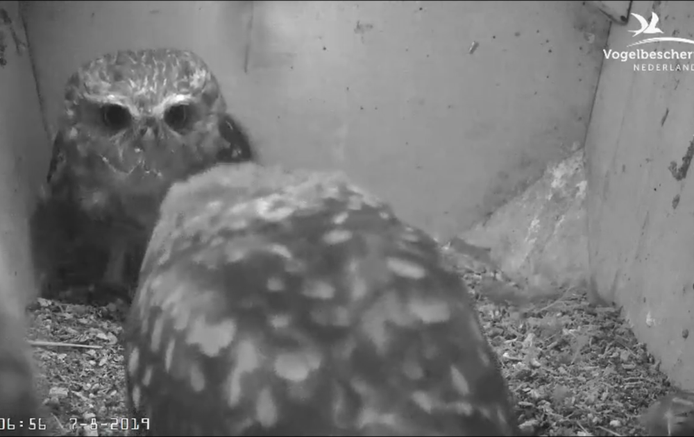 De twee jongen zijn in de nestkast. Man steenuil komt op bezoek bij zijn kinderen.