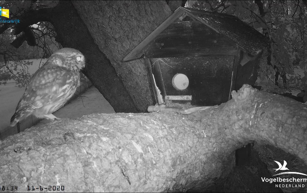 Man steenuil roept dat hij een muis in de aanbieding leeft. Vrouw reageert snel en weet het ongeringde jong te vinden.