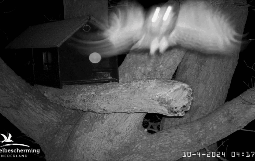 Man staat met een larve voor de nestkast, hij rekent niet op een actie van zijn broedende vrouw.