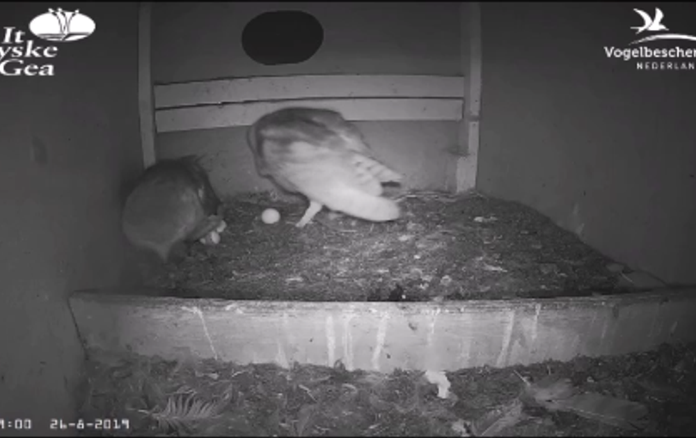 Vrouw raakt zelf een van haar eitjes kwijt, en als man een muis komt brengen wordt er eerst flink geknuffeld. Daarna ziet man 't eitje liggen en werkt het nog iets verder buiten de nestkom. Maar vrouw, goede moeder als zij is, weet 't verloren ei weer netjes terug te halen