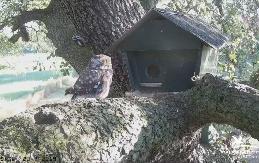 Man steenuil zit voor de kast op 23 juli. Een middelste bonte specht daalt af langs de perenboomstam. Die middelste bonte specht is best zeldzaam. Man en vrouw hebben een rood "petje".