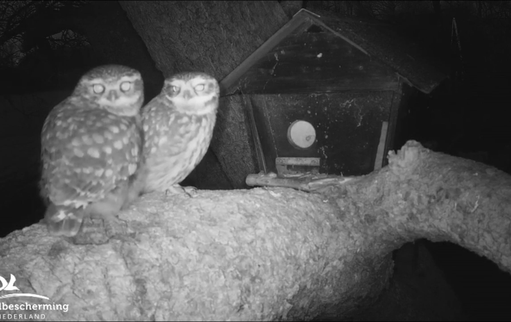 Vrouw steenuil heeft overdag in de nestkast gedut/gepoetst en komt naar buiten als ze man steenuil hoort. Daarna werken ze hun avondprogramma af, maar er zijn meer steenuilen te horen, waarop ons koppel af en toe lijkt te reageren.