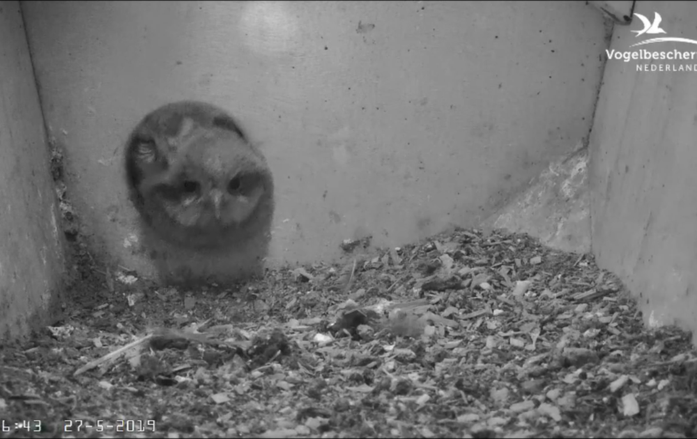 Twee kuikens proberen tegelijk door het "binnenvlieggat" te gaan en één kuiken volgt de muggen voor de nestkast