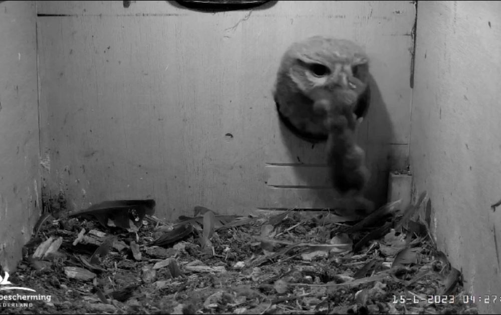 Een jonge steenuil komt met een ware muis aan bij de nestkast en bewaart die muis net als een ouder dat zou doen. De muis zal nog niet zelf gevangen zijn.