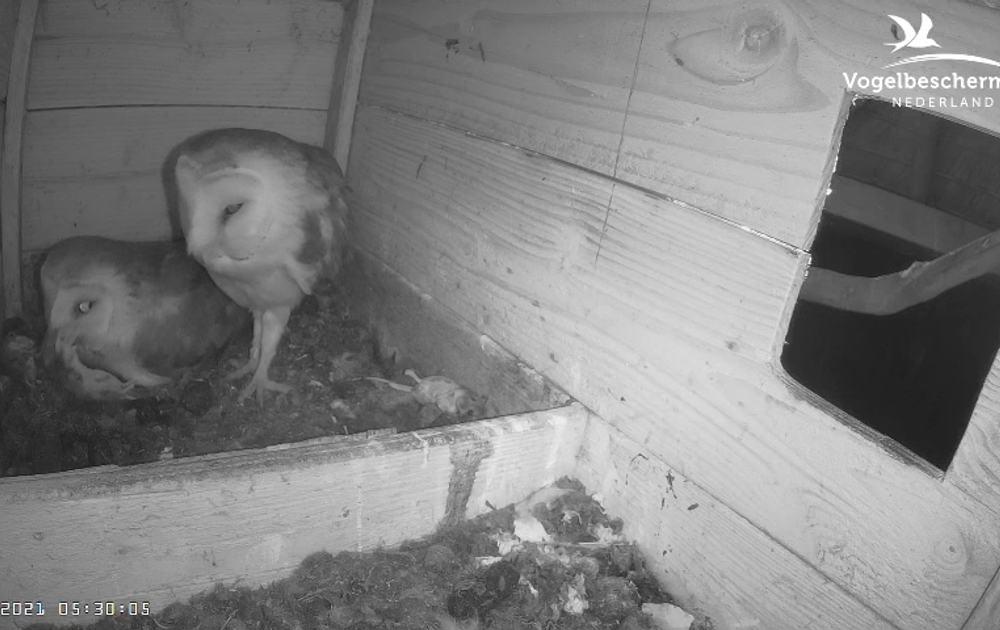 Het vrouwtje laat zich de muis niet meer van het bord eten, maar man uil geeft het niet op