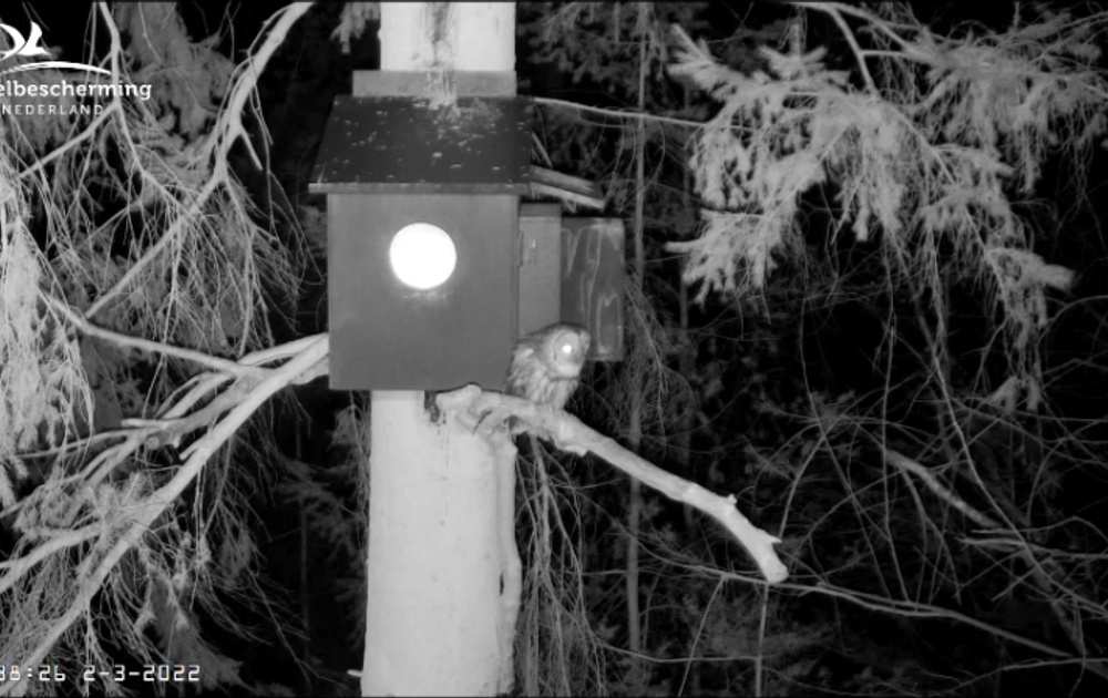 Vrouw bosuil lijkt te bedelen op enige afstand van de camera en man bosuil lijkt te proberen haar naar de kast te lokken. Maar ze vliegt weg en man bosuil kijkt haar na. Hij kort daarna de andere kant op.