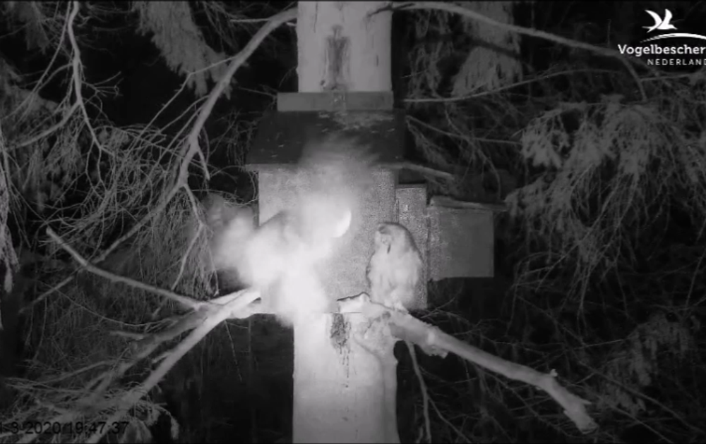 Geen prooioverdrachten afgelopen nacht (tenminste niet in beeld). Na een dag broeden gaat vrouw bosuil er zelf op uit.