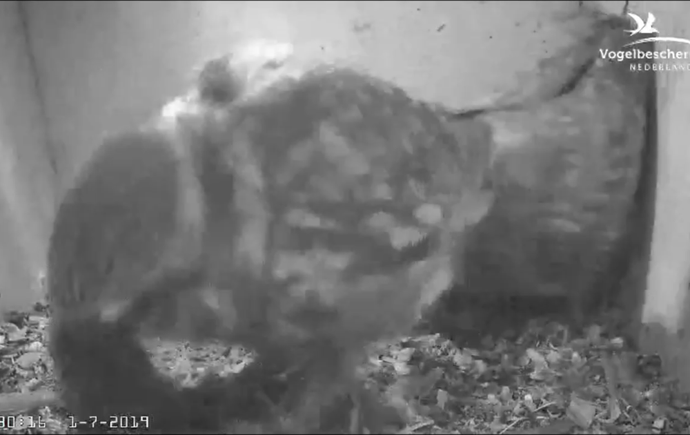 Voor het eerst in 10 dagen weer eens een muis aan huis. Vrouw steenuil brengt een muis in de kast. Het rechtsgeringde kuiken moet flink zijn best doen de muis te veroveren, maar het lukt. Vrouw vertrekt en het kuiken kan rustig de muis eten.
