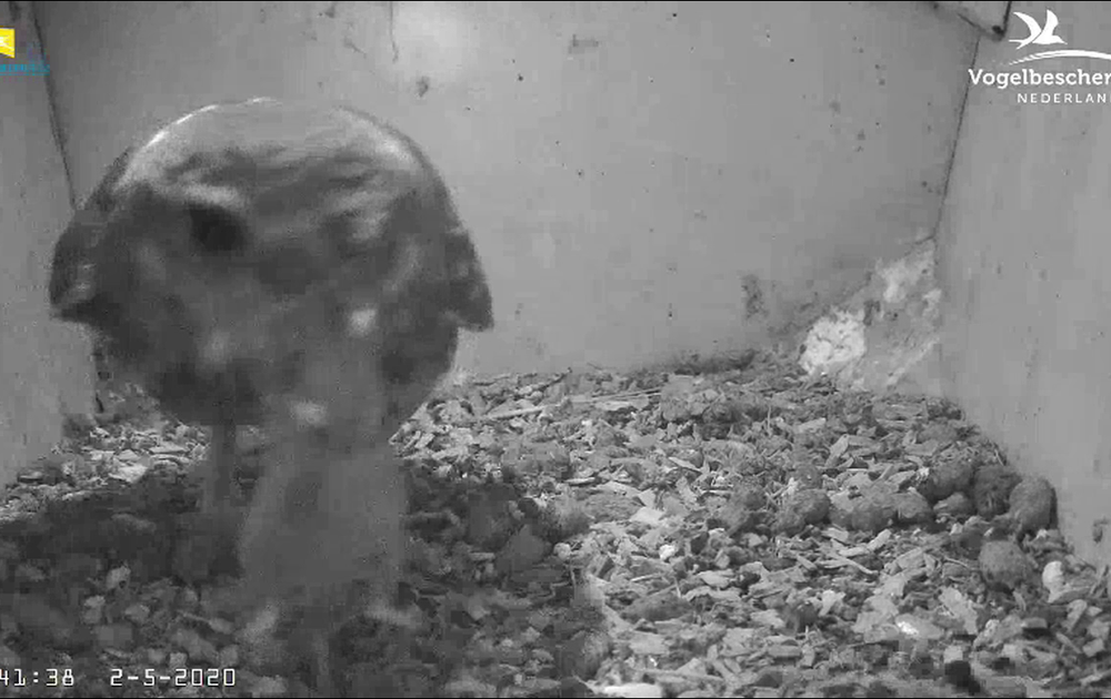 Man steenuil brengt in korte tijd twee muizen. Eindelijk substantieel voedsel voor de kuikens.