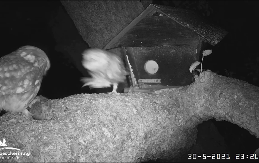 Vrouw steenuil heeft de hele dag in beeld weinig te eten gehad, maar lijkt geen honger te hebben. Ze bergt de muis op, eet er niet van.