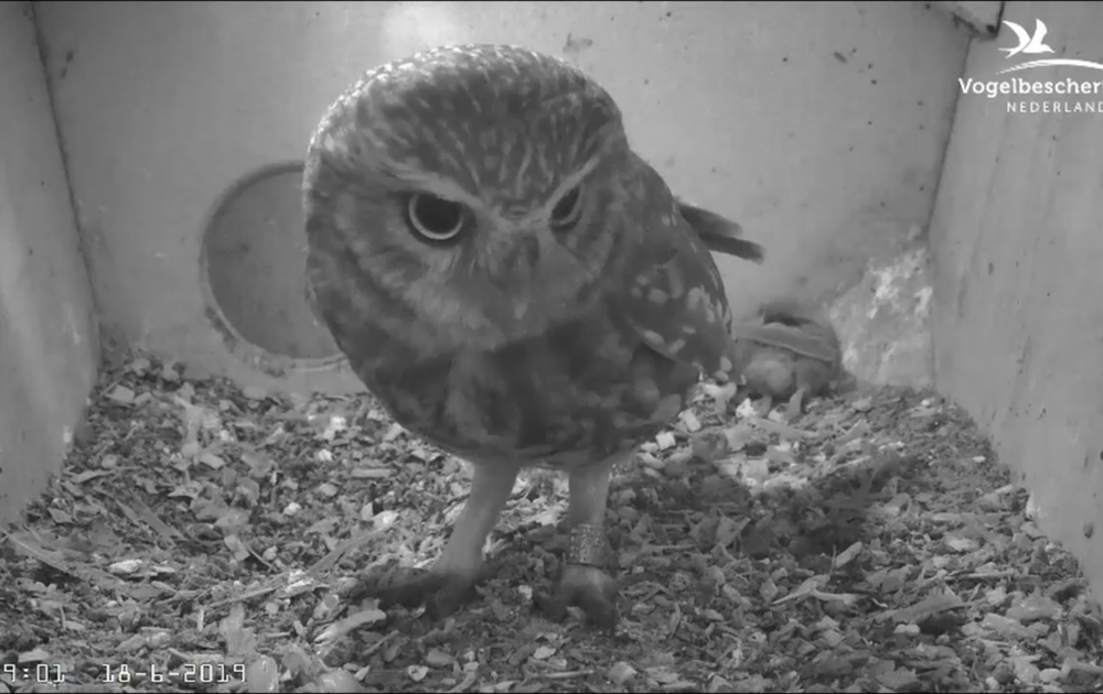 Hittestand: als het erg warm is houden steenuilen hun vleugels af van het lichaam en hebben een pulserende keel door snelle ademhaling. Alles voor de luchtverversing. Vogels zweten niet, dan moet het maar zo.