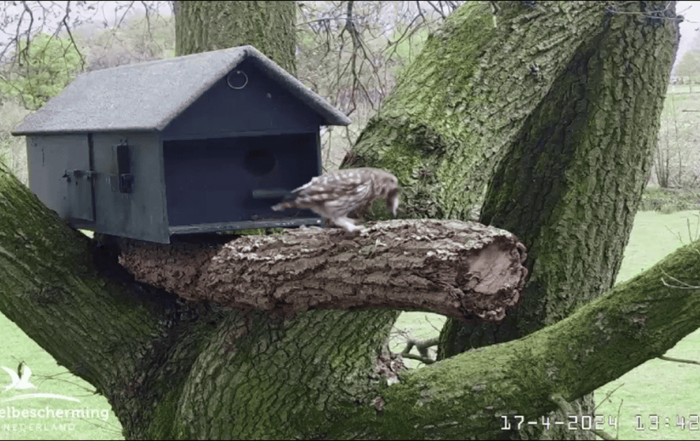Voor het eerst brengt Man steenuil midden op de dag een prooi naar de nestkast: een woelmuis.