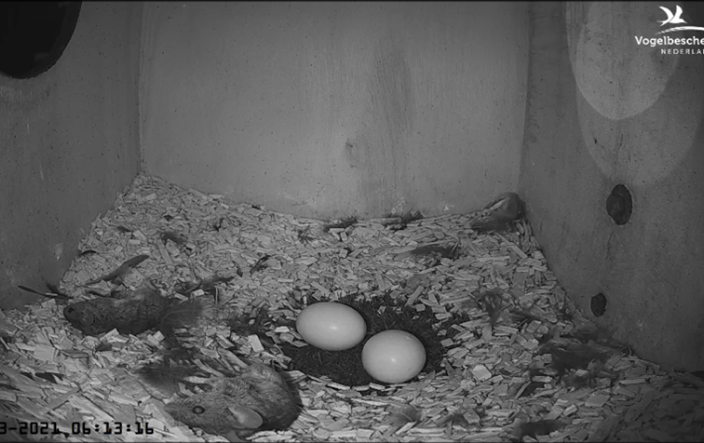 Gisteravond en vannacht legde vrouw bosuil de gekregen prooien 'op voorraad' en was het geriedel uit een van de eieren steeds beter hoorbaar.
