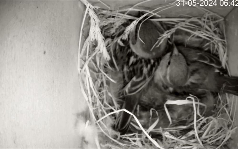 De mussenman zie je niet zo vaak in het nest. Dat is het domein van de vrouw. Vanochtend kwam hij even checken of alles er goed bij lag, maar hij werd er al snel met een paar fikse pikken in zijn kuif uitgebonjourd.