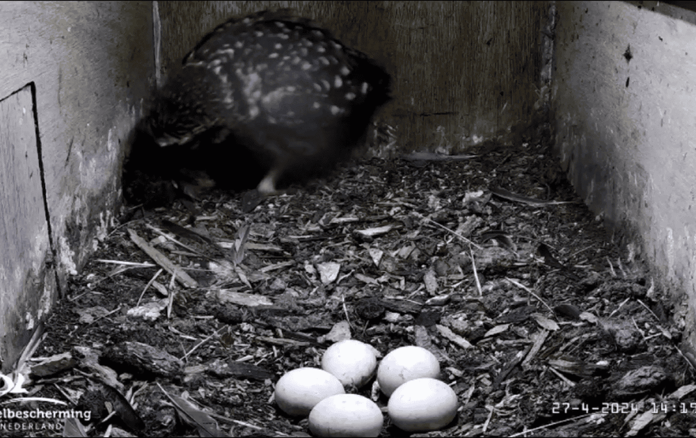 Na de beeldstoring van 4 dagen, blijken de steenuilen er goed bij te zitten. Nog steeds vijf eitjes en vrouw heeft een groot stuk konijn (of haas) als voorraad in nestkast, ze eet er goed van.