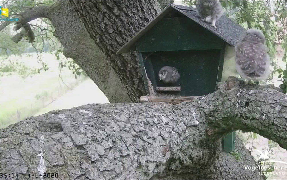 Het ongeringde kuiken breidt zijn gebied uit tot het dak van de nestkast en de stam daarachter.