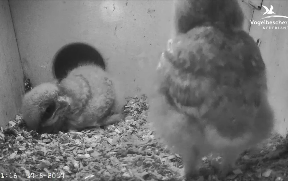 Het gezinsleven van de steenuilen verplaatst zich in de richting van het vlieggat van de nestkast.