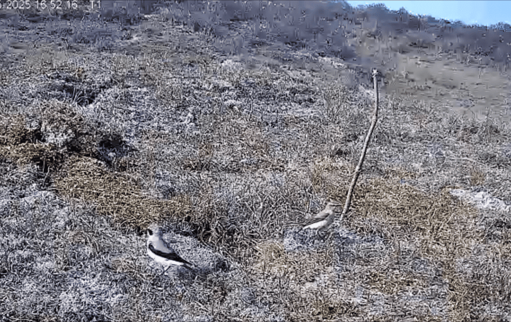 Om een vrouw te kunnen lokken moet Man Tapuit het konijnenhol eerst omtoveren in een tapuitennest. In het filmpje van 15 april zagen we al even een vrouw om het hoekje kijken. Blijkbaar was ze nog niet direct onder de indruk. Maar zo gemakkelijk geeft Man niet op. Met zijn mooie baltszang weet hij haar over te halen om het hol van binnen te komen inspecteren.