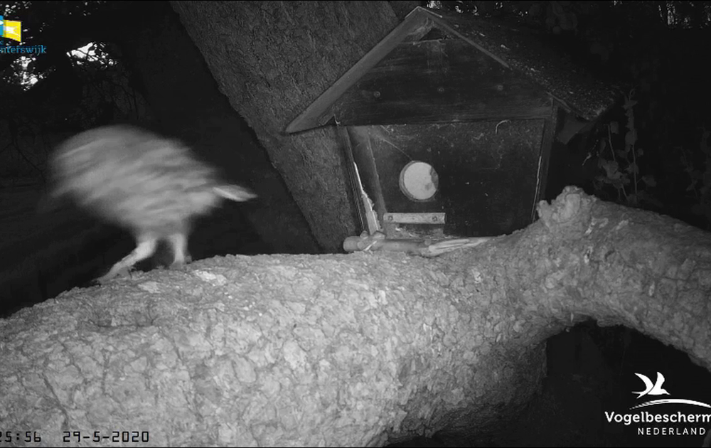 Man steenuil biedt een meikever aan aan twee kuikens in het vlieggat. Ze willen niet. Dan rent hij maar weg.