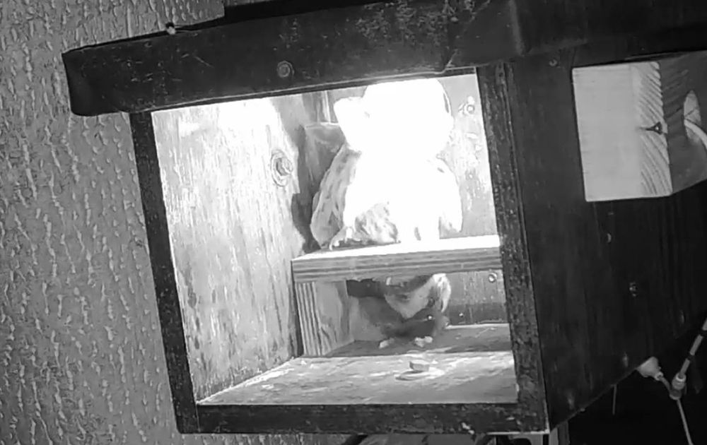 Vrouw steenuil is op stap, als Man met een veldmuis bij de nestkast komt.