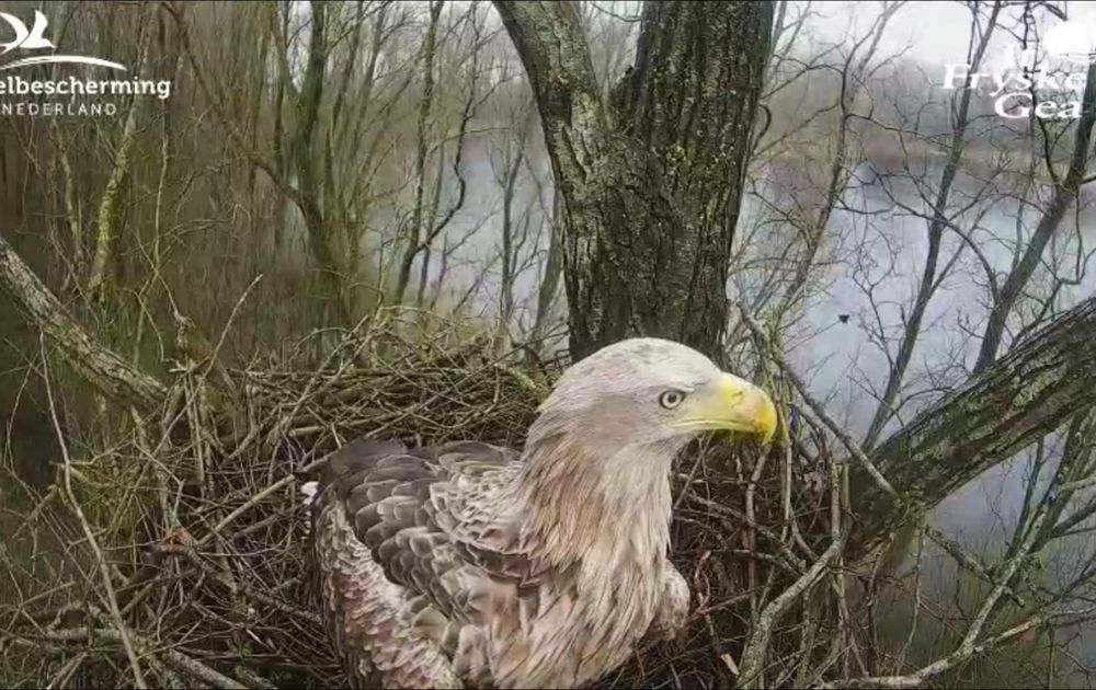 Het mysterie blijft, de haviken komen met takjes naar dit nest, maar het zeearend mannetje ook. En dat is bijzonder, omdat er een sterk vermoeden is dat het vrouwtje allang een ei heeft op het andere nest. Maar ze zou ook aan het proefbroeden kunnen zijn, dus heel misschien gaan we toch jonge zeearenden in dit nest zien.