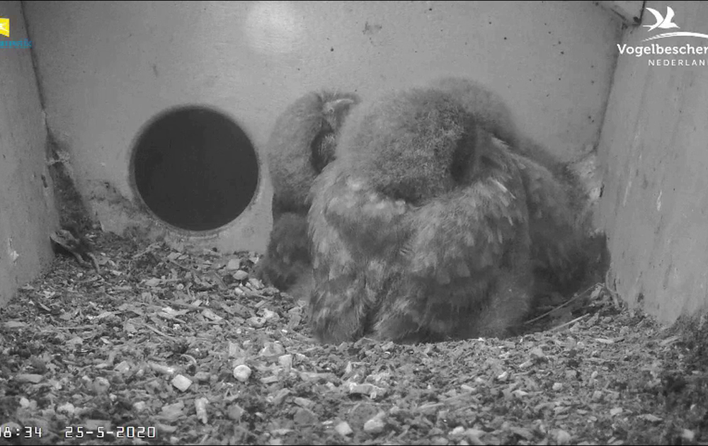 De drie kuikens bereiden zich nog voornamelijk in de broedruimte voor, op wat komen gaat.
