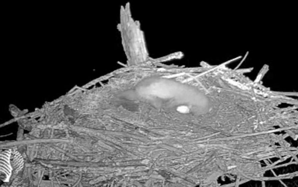 Omdat de Ganzen en ook de Visarend gisteren (7-4) niet op het nest bezig geweest zijn ligt dit (aangebroken) ei dus nog verstopt in het nest!