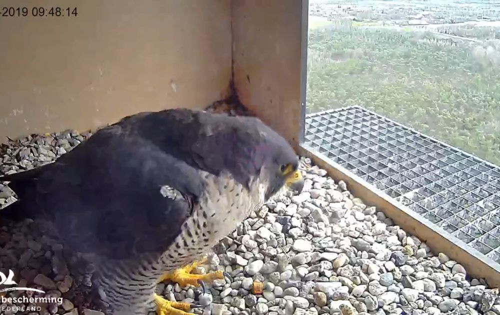 Vanmorgen leek het ei te komen, vroouw had de kuil nog wat extra uitgediept, en bleef heel veel in de kast. Na enen vertrekt ze , en dan komt er een vreemde geringde valk in de kast