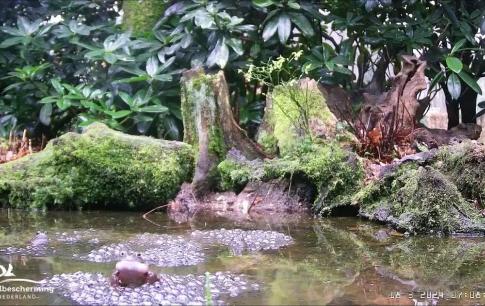 In een paar dagen tijd lag de vijver vol kikkerdril. Ze hebben het er maar druk mee!