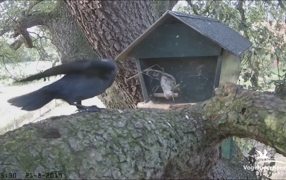 Vrouw steenuil kwam met een nog levende muis (+ gras) de nestkast in, de klauwen in de rug van de muis zijn dodelijk maar nu duurde het even. Daarna eet vrouw de muis grotendeels op (voor zover dat te zien was).