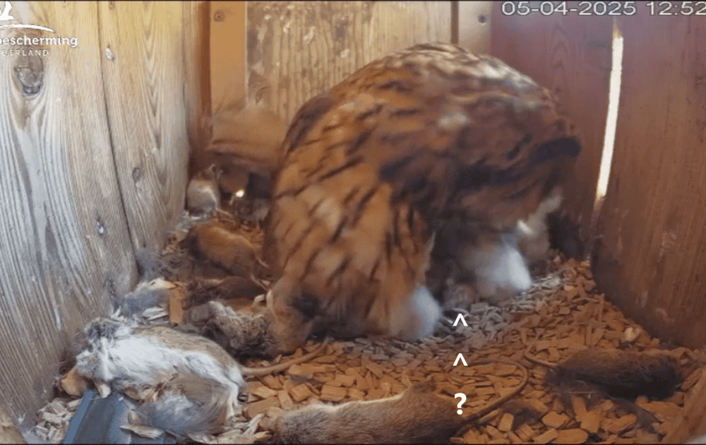 Met aan zekerheid grenzende waarschijnlijkheid is het derde kuiken uit het ei gekropen. Toen vrouw bosuil zich achter de oren krabde, was er tussen de twee donzige kuikens een pas uit het ei gekropen kopje van een kuiken te zien. Tenminste: met aan zekerheid grenzende waarschijnlijkheid.