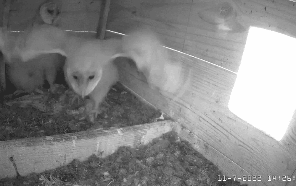 De kuikens zijn druk aan het oefenen om straks volwaardig uil te kunnen zijn, prooi bespringen, vleugelen (vliegen is wat lastig in de kast) en fixeren.