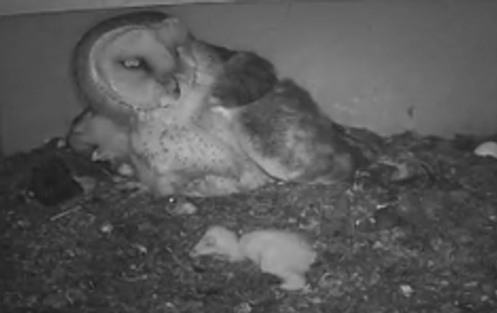 Tijdens het voeren verliest een van de kuikens zijn/haar evenwicht en rolt weg.