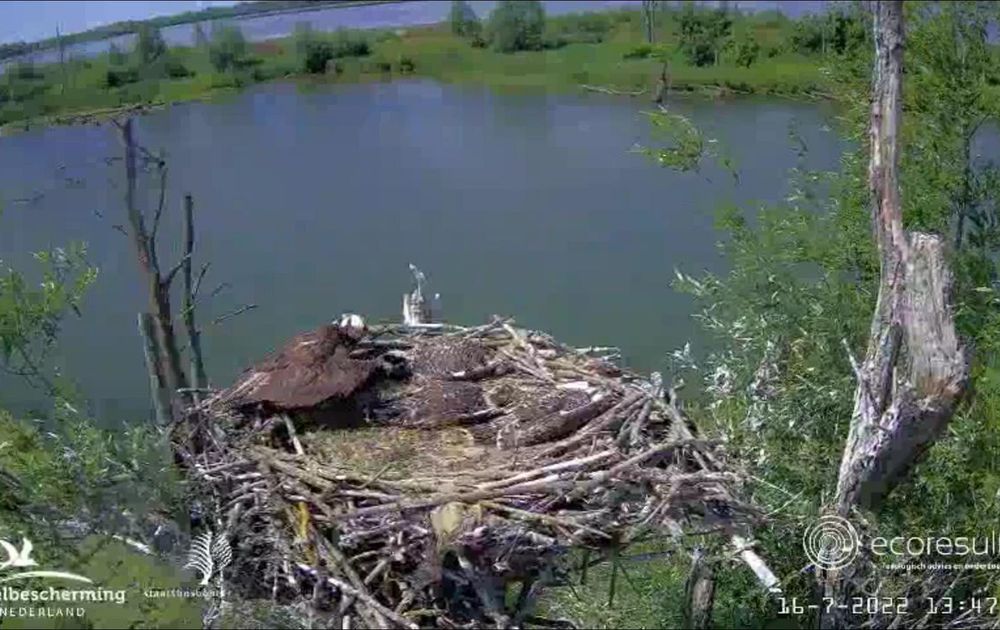 Over het algemeen is het vrij rustig op het nest. Er wordt gegeten, de vleugels worden gestrekt en vooral veel gelegen. Totdat er alarm wordt geslagen door vrouw visarend. De jongen duiken instinctief omlaag en houden zich heel stil. Vrouw beschermt haar "kleintjes" door zich groot te maken, haar vleugels zoveel mogelijk over hen heen uit te strekken en hard te krijsen