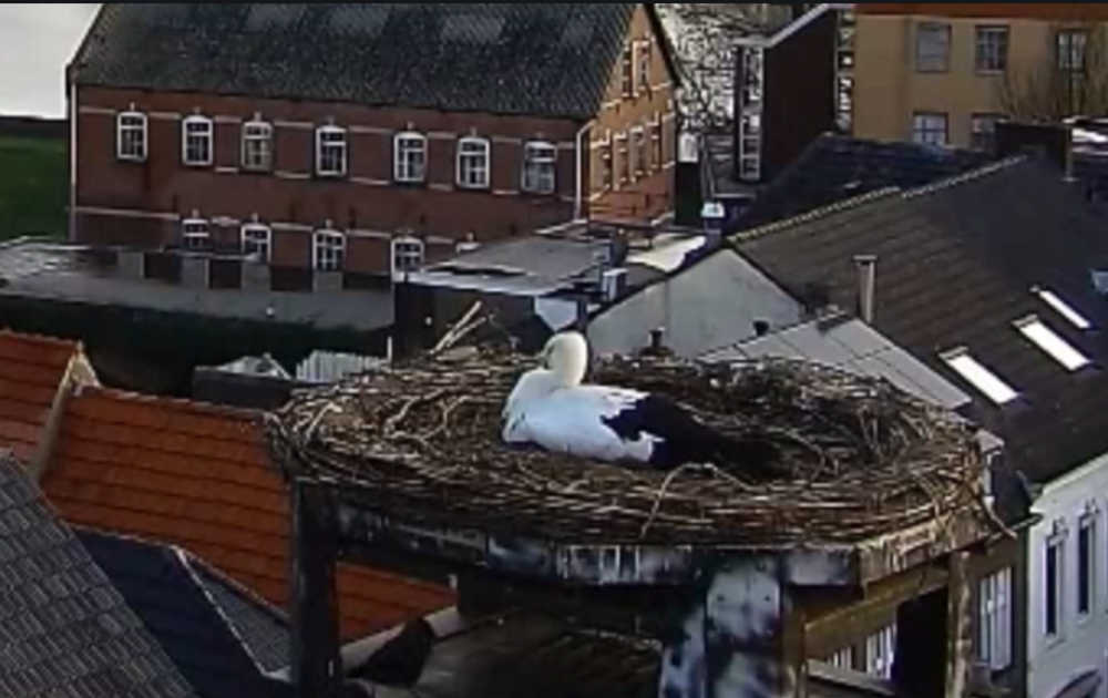 Onder het nest van de ooievaars is een ruimte. Die ruimte werd voorgaande jaren door o.a. kauwen gebruikt om te nestelen. Voor de kauwen gemakkelijk want een etage hoger konden ze takken stelen. Dit jaar hebben we nog weinig beweging onder het nest gezien.