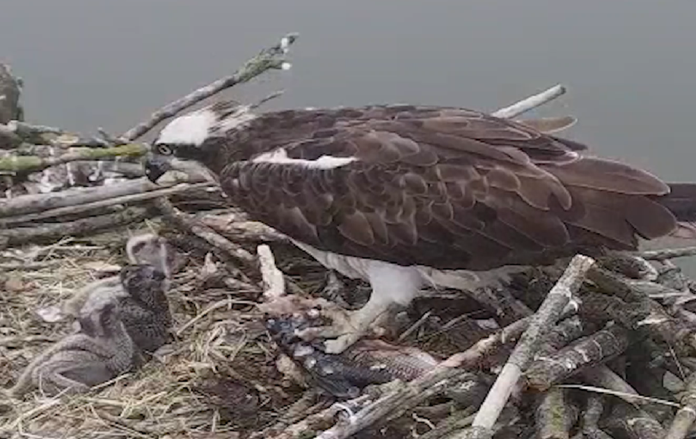 De visarendkuikens worden met de dag groter! Voor nu zijn het nog kwetsbare jonge vogels, goed beschermd door beide ouders.
