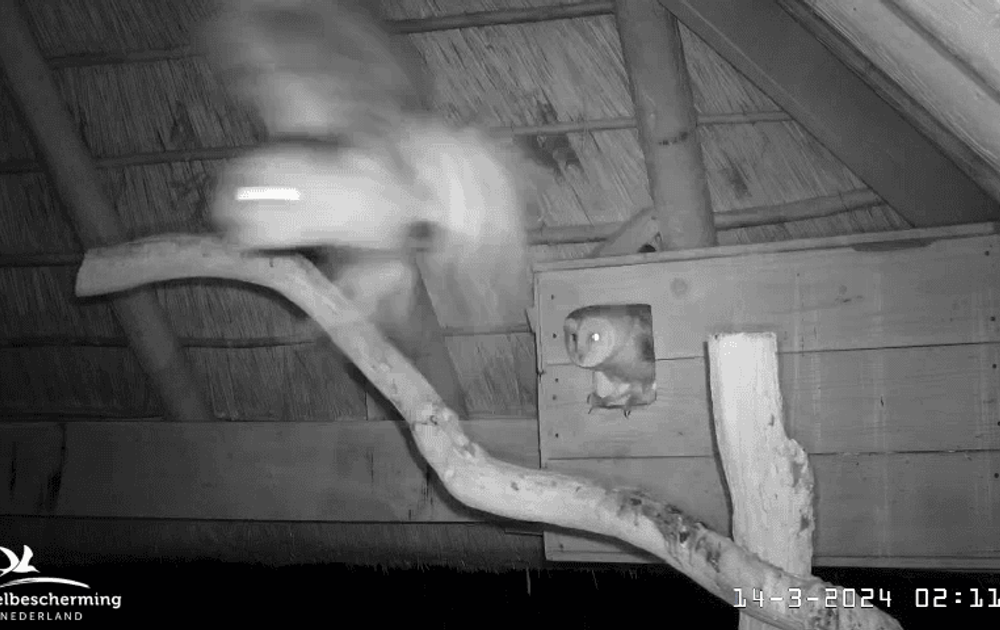 Een vreemde uil dacht even op bezoek te gaan in onze hooiberg.