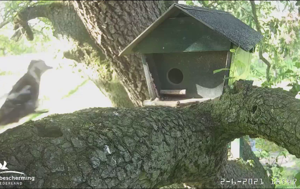 Man jaagt ongewenste kauwtjes weg en een roofvogel? komt langs. Zeldzaam is de Middelste bonte specht met zijn rode petje en witte gezicht.