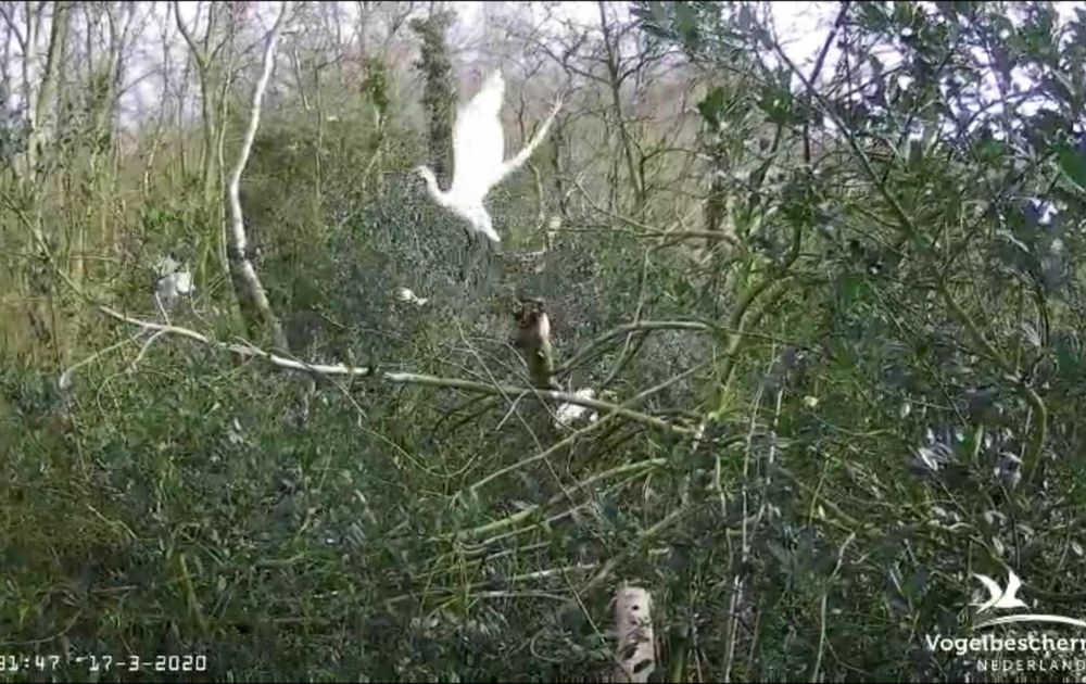 De Lepelaars komen dagelijks weer vroeg aan. De activiteiten zijn nog beperkt. Ze zitten ook veel achterin in de Hulst of de bomen in de achtergrond. Ook worden ze nog dagelijks ‘opgeschrikt” . Vanmorgen was een paring te ontwaren, maar tegen 8:00 uur …