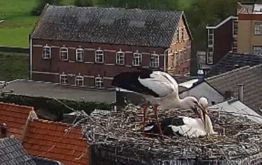 Ze blijven ons verbazen, onze ooievaars. Normaal voeren ze elkaar niet. Of dit nu toevallig is, of om alvast te oefenen voor volgende week … Het blijft apart, maar zo te zien genieten ze ervan.
