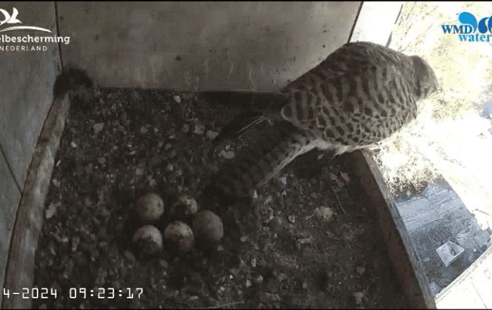 En ja hoor (misschien wel door de stress van de 'burenruzie' iets versneld) legt vrouw torenvalk het vijfde ei.