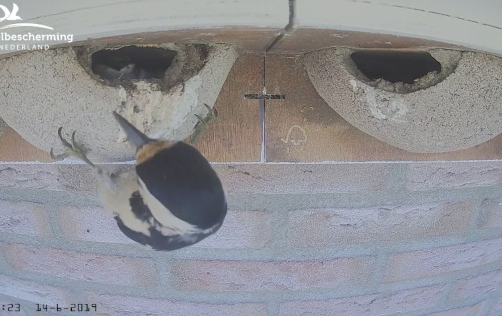 Ineens duikt er tussen de kommen een onverwachte gast op en spring vanaf de muur op het nest. Na een kort conflict weet de specht dat hij hier niet welkom is en gaat er weer vandoor. De zwaluw maakt zich breed beschermt zo zijn jongen.