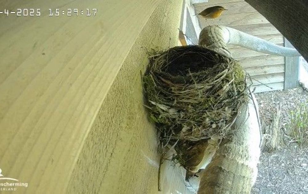 V merel is nog druk bezig met haar kunstwerk. dit trekt ook de aandacht van de andere vogels uit de buurt.