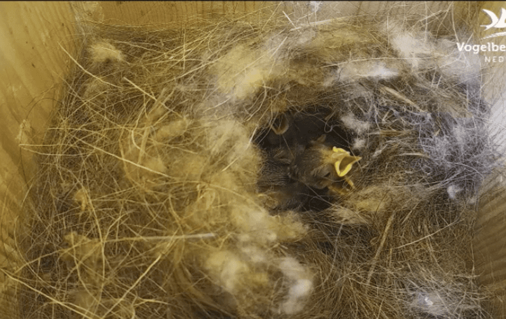 Vrouw pimpelmees heeft tot nu toe de nestkom onder de bovenkant flink vergroot; de kuikens zitten nu bijna tot onder in het beeld.