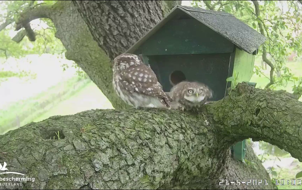 Man steenuil gaat aan de slag, aangespoord door het bedelsnurken van Vrouw.